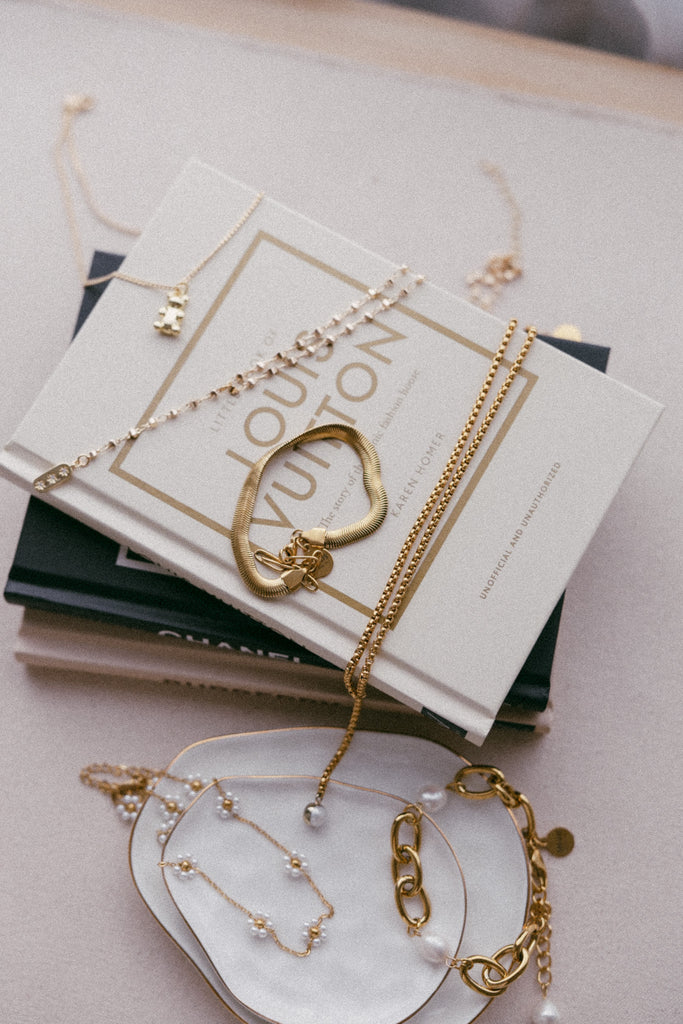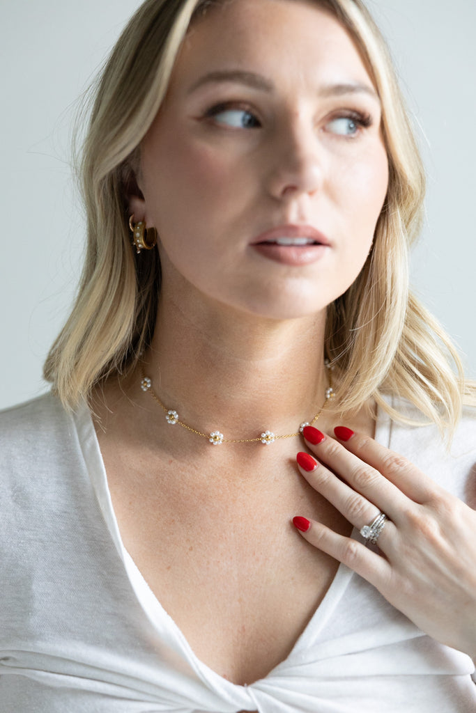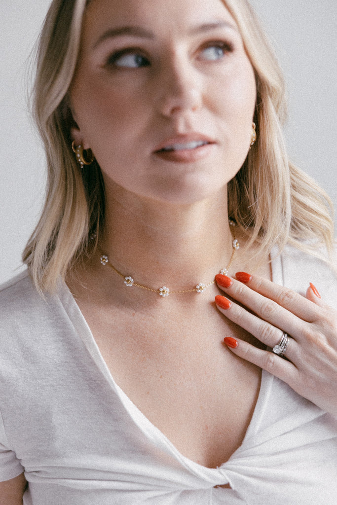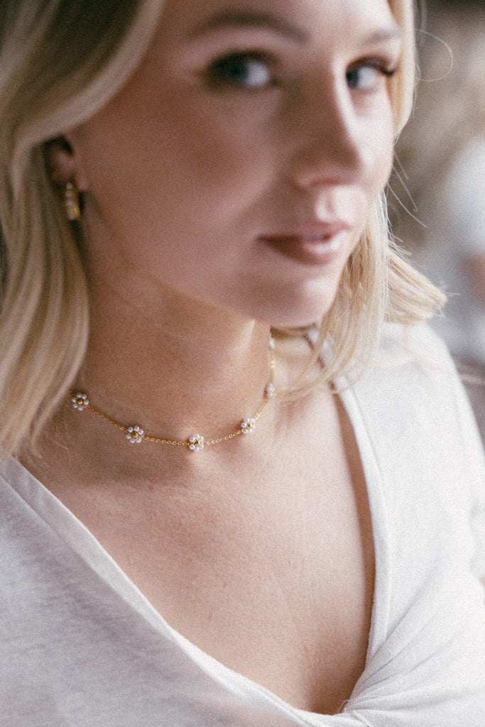 Lovely Pearls Flowers connectors attached to a 18k gold plated over stainless steel dainty chain. Measures: 15.5" + 2" length. 18K gold plated over stainless steel, Water resistant, Hypoallergenic. Lead and nickel free.